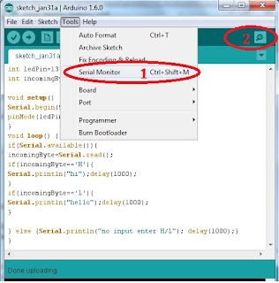 1) Tools-->Serial Monitor or 2)directly by clicking on Serial Monitor.